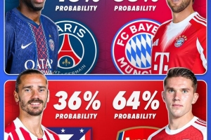 欧冠4强晋级决赛概率:拜仁55%,巴黎45%,阿森纳64%,马竞36%