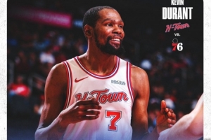 赛后,火箭官方晒出本场杜兰特的数据海报,KD满脸笑容。